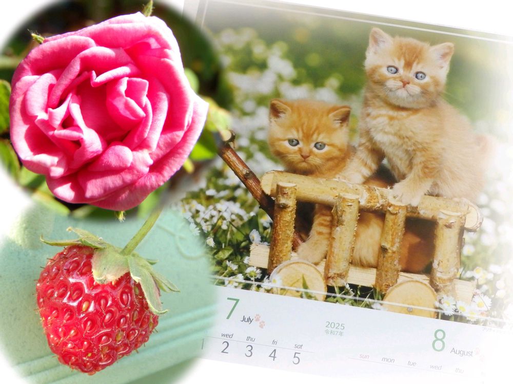 ➡️動物病院の猫カレンダーは、ブリショーのきょうだい。お花はローンデージーかな?🏷️カレンダーの日