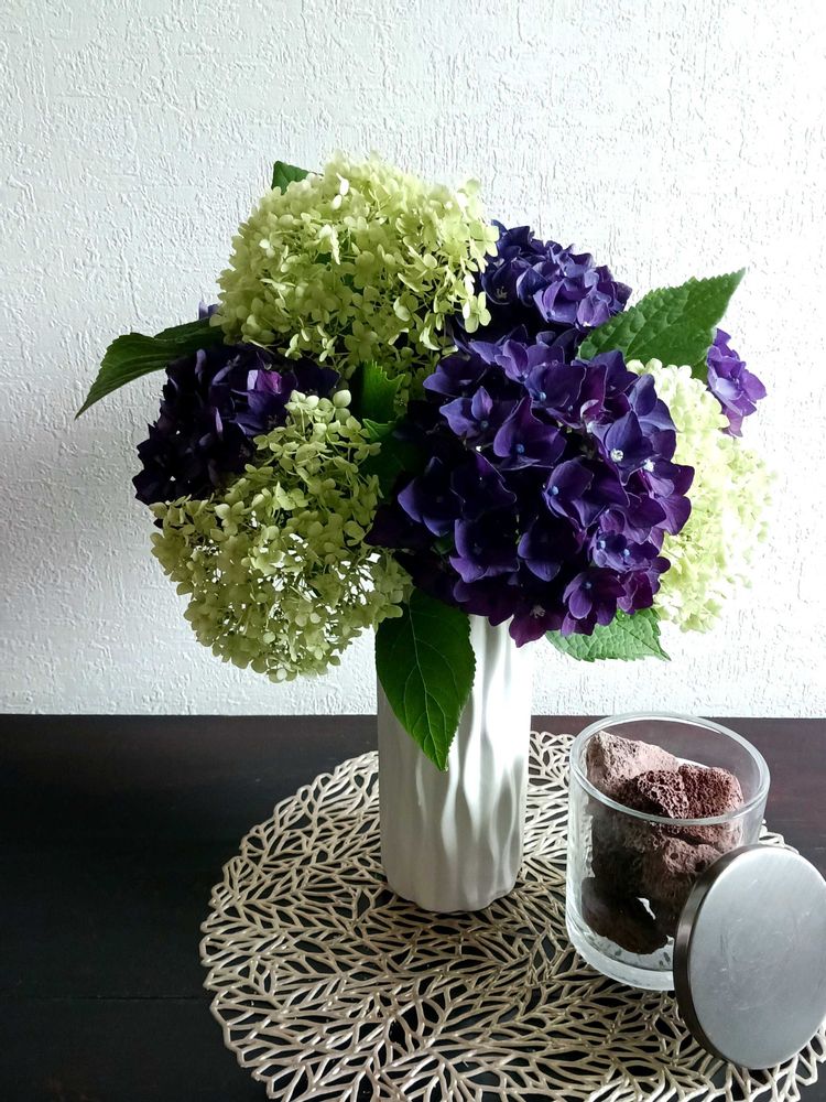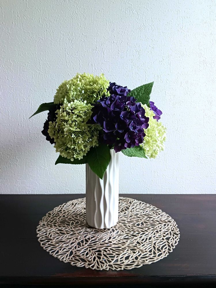 ディープパープルとライムのアナベルを合わせてお迎え花にしました。