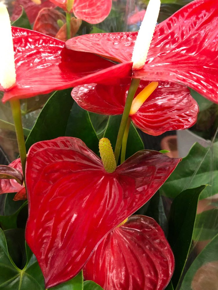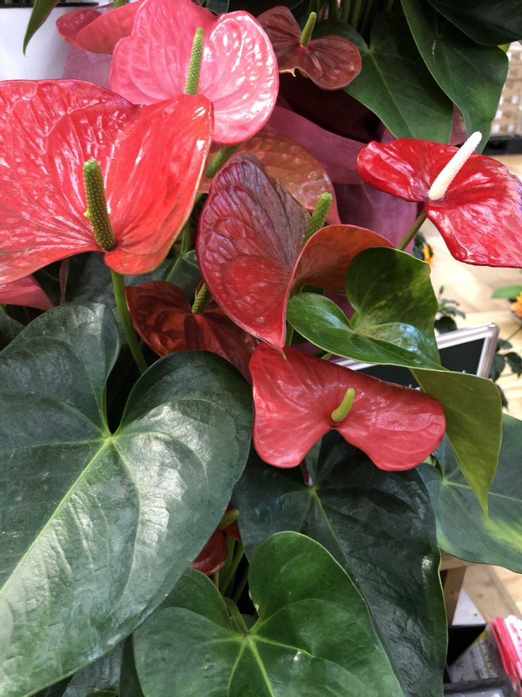 こんばんは🌛めっちゃ、真っ赤なアンスリウムさんだね❤️❤️❤️沢山お花咲いてるね🥰4枚目の子はめずらしい🤩最近はピンクのをよく見かけます💓