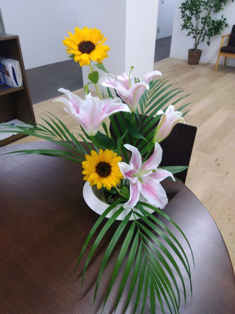 🌻の明るさとユリの良い香りに癒されます💐職場の皆様やお客様に季節のお花を届けるのが楽しみです💐