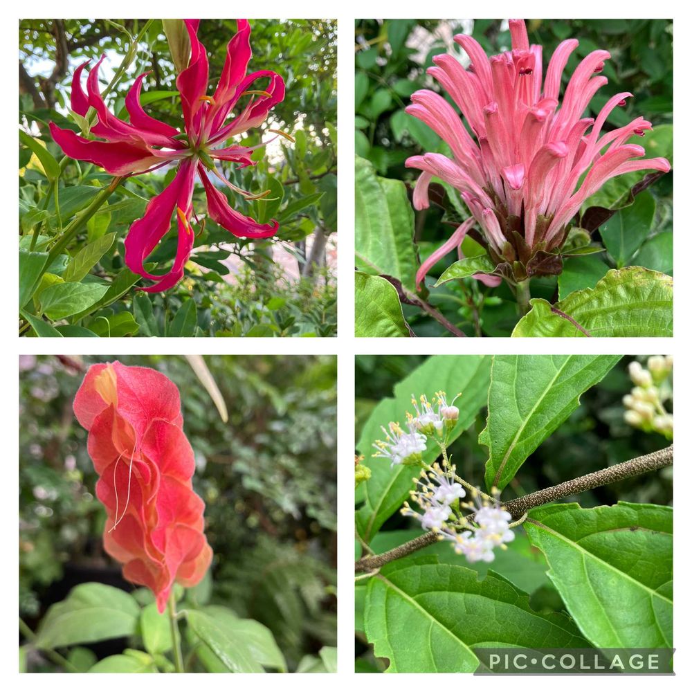 グロリオーサ、サンゴバナ、コエビソウ、コムラサキ
