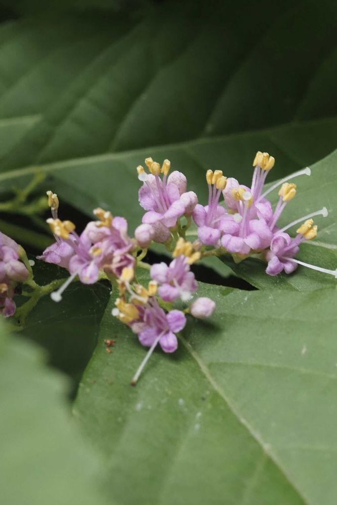 ムラサキシキブ(紫式部)シソ科ムラサキシキブ属の落葉低木。咲き始めました。可愛いネ。雄蕊も雌蕊も、ツンツンツ〜ン。