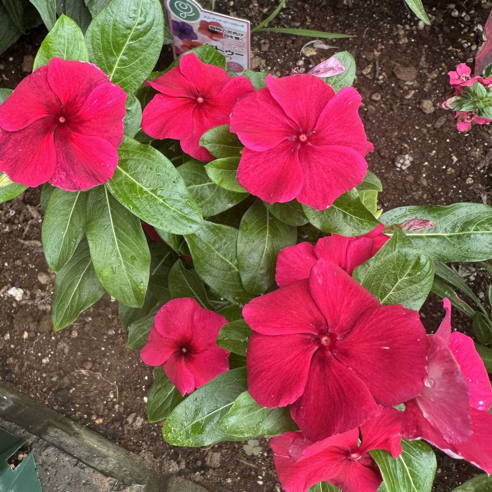 日々草は日々大きくなっていく様子。そばの赤系のお花のお花と一緒