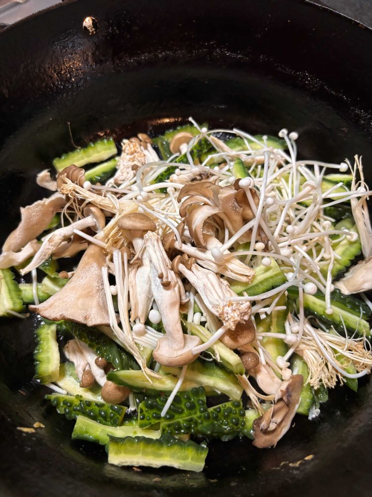 ゴウヤ、しめじ、エノキ、舞茸中華炒め