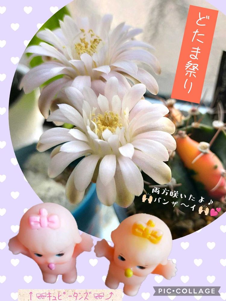 3枚目 ギムノさんのお花、両方満開になったよ〜🙌🏻🎀キュピータンズ🎀も喜んでるね︎(,,>᎑<,,)♡💕