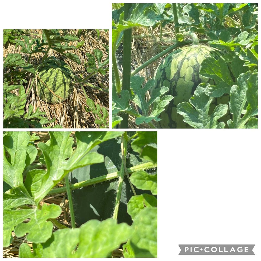 ② スイカ🍉は3種類 普通のと黒皮と小玉 今の所4つ結実🙌 多くなくていいので甘くて美味しいのを収穫したいわ