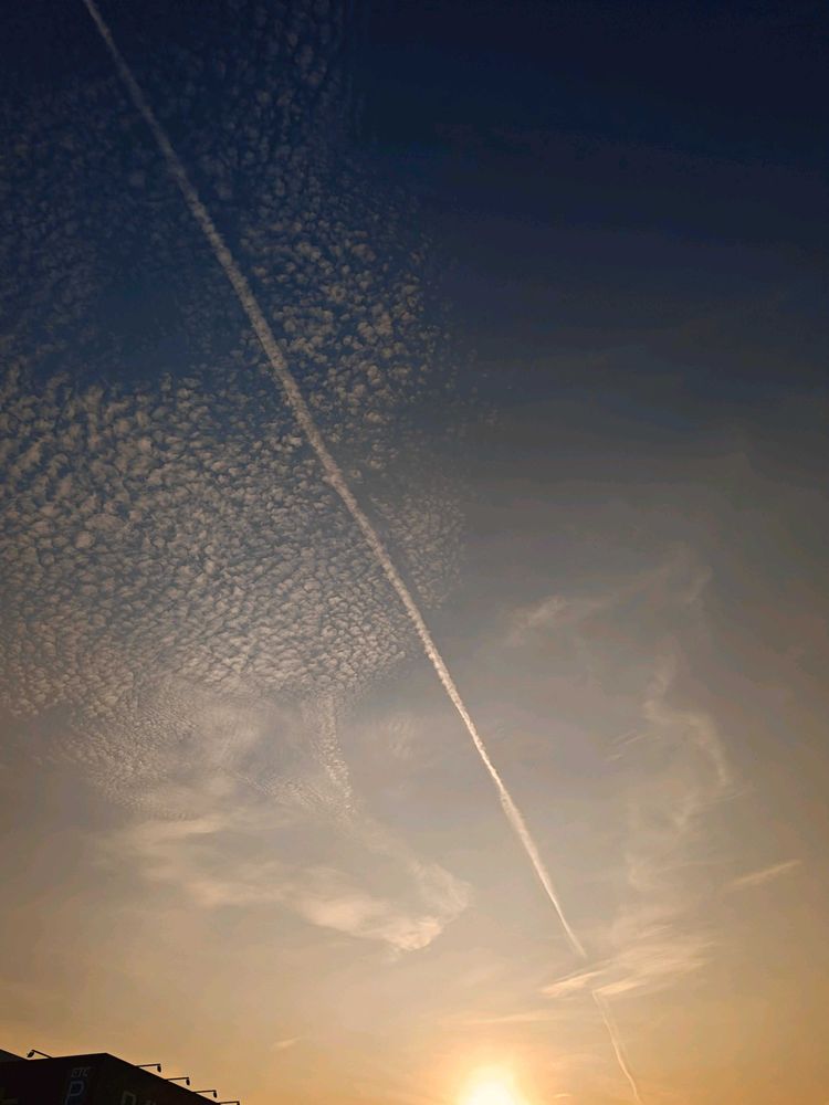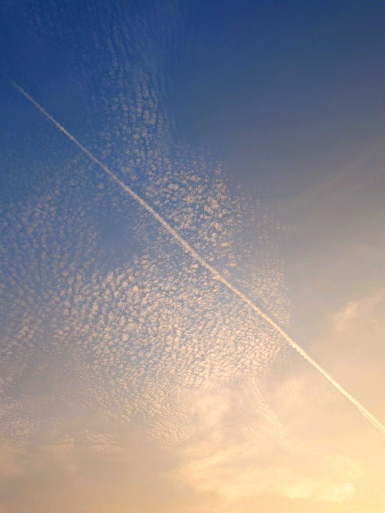 昨日の朝、通勤途中に見上げた空。日の出の空に飛行機雲。神々しい空でした✨️。