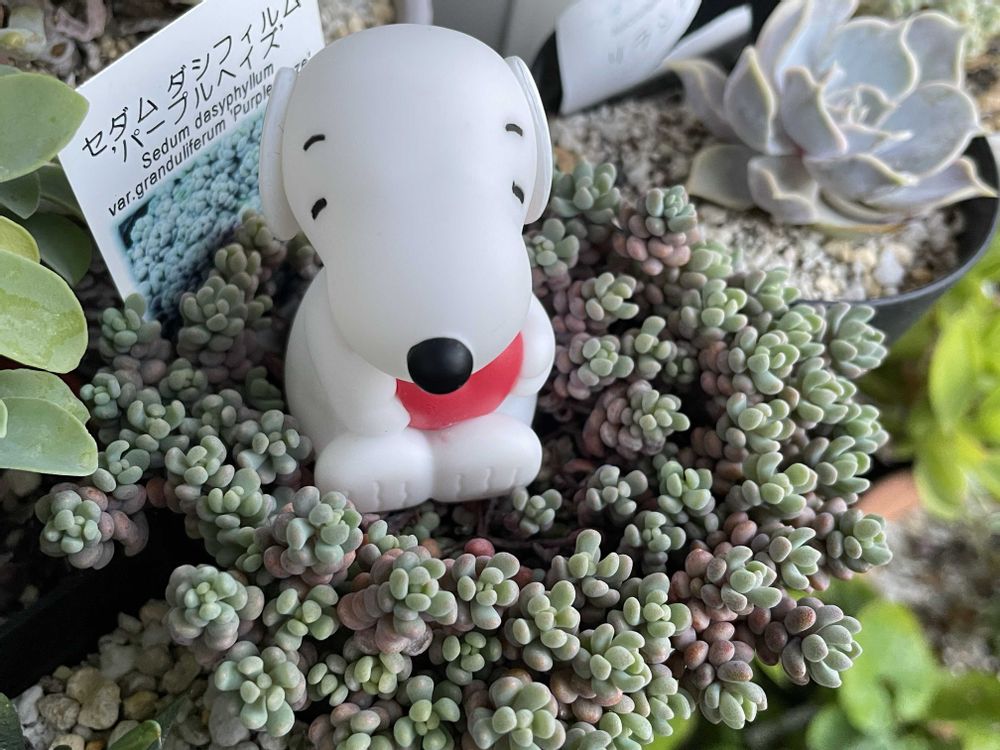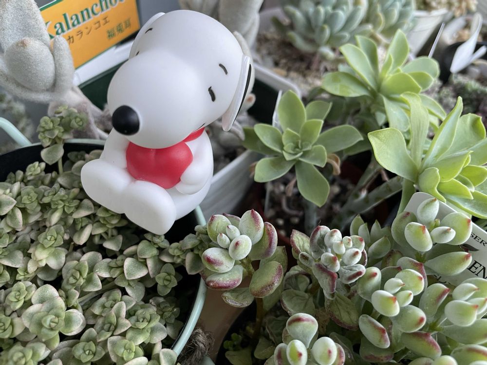 間違いなかったらいいな😊かわいい小さな花が咲いてるよ🌸多肉は似た様なのが多いから名前が分かりにくいよ。スヌーピーちゃんとマッチしてかわいい😍