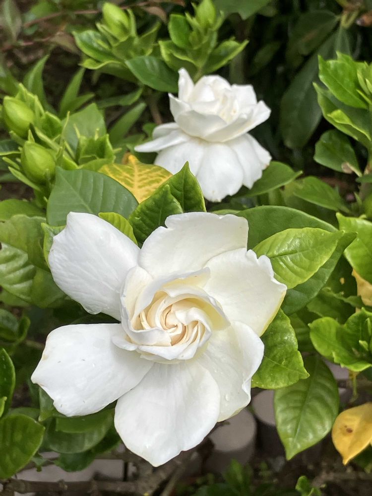 玄関のトルコギキョウとダリア、庭のイトバハルシャギクとヤエクチナシが元気です。😄😄😄