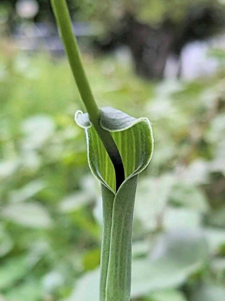 ③葉柄の途中と小葉の基部に珠芽(ムカゴ)を付けソレで増え花茎は高さ20〜40cmで葉より高く緑色または帯紫色の仏炎苞に包まれた肉穂花序を付けます🌿