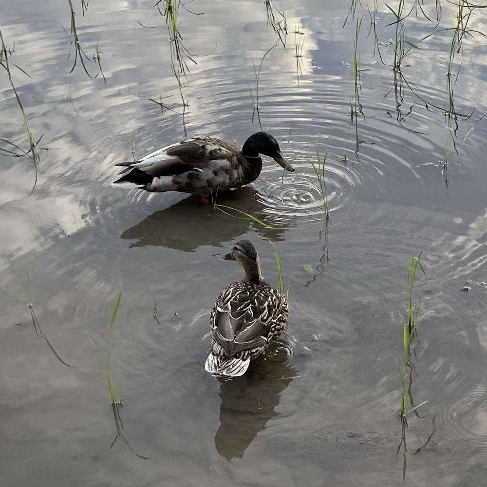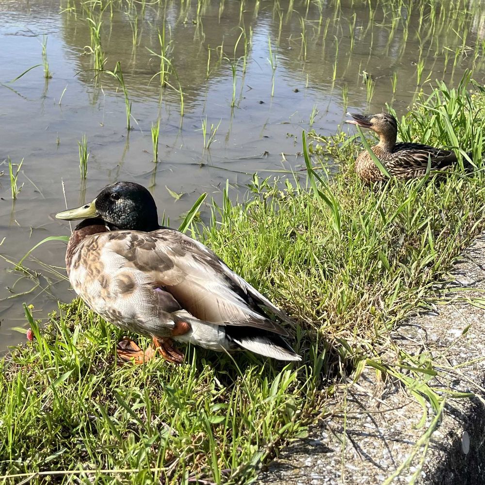 ②③隣の田んぼに来るカップルのカモ🦆産卵したけど温め放棄で、隣のご主人が孵卵器購入して卵の孵化を試していらっしゃいます🪺