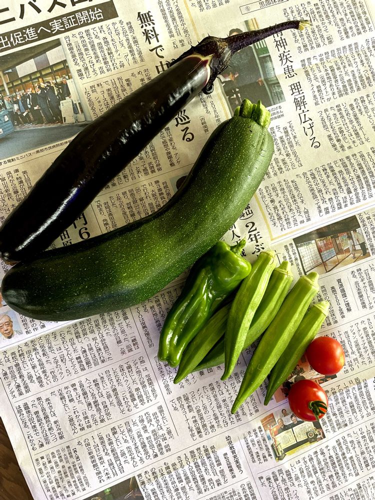 庄屋大長ナス、ズッキーニ、五角オクラ、濃いあまトマト少しずつ収穫できてきました(^^)