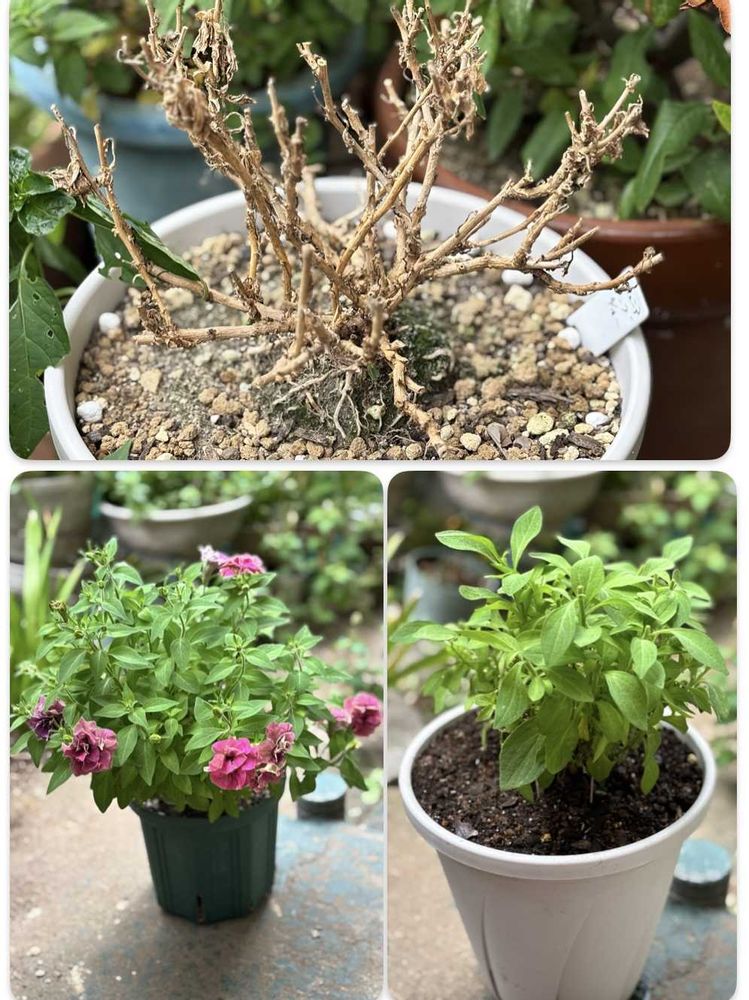 ④モニター親株濃いピンクが切り戻しと植替え後不調になり遂に星になりました😢おそらくすぐに炎天下に出してしまったからかな、と思っています…🤔幸い育っていた濃いピンク挿し芽株があり、植替えて繋ぐ事が出来ました。冬越しもして1年頑張ってくれたのでお疲れ様ありがとうです😌