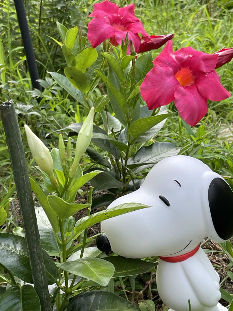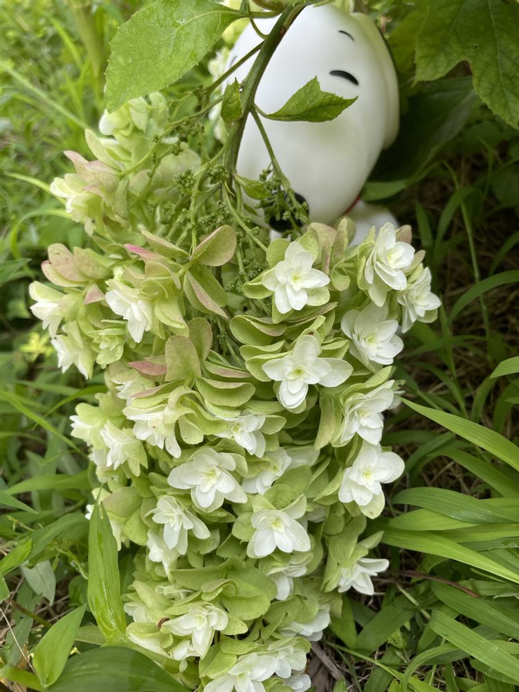 今日のm花壇 スヌーさんが見回りに〜🌿 サマーラッシュ、柏葉紫陽花、サルビア、