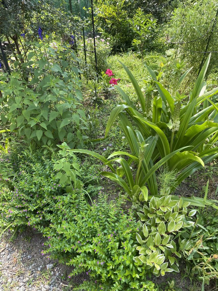 ⑤m花壇 なぜか…草ぼうぼうです笑ペコリ サマーラッシュ植え付け場所間違ったかも🤣💦と思っていましたが、赤いサマーラッシュが映えていいかも〜🤭❤️