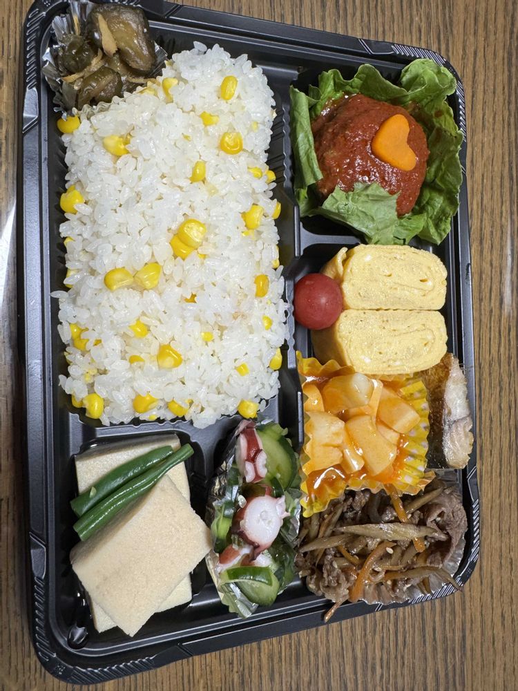 1枚目・今日はとうもろこし🌽ご飯(バター入り)・きゅうりの🥒Qちゃん漬け・煮込みハンバーグ・甘めのだし巻き卵・ミニ🍅・焼き塩鯖・アカイカ🦑のチリソース煮・牛肉入りきんぴらごぼう・タコ🐙の酢の物・高野豆腐の煮物でした。