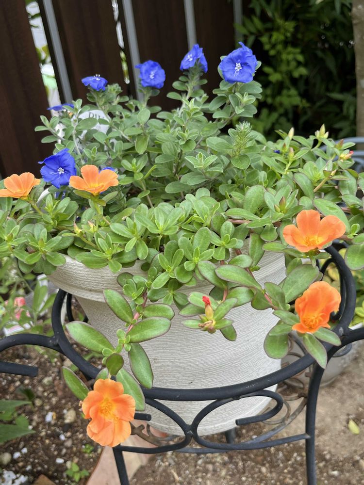 ポーチュラカ植える所なくて一緒に植えておいた所、大きくなり花が咲き色合いがいい感じかなー