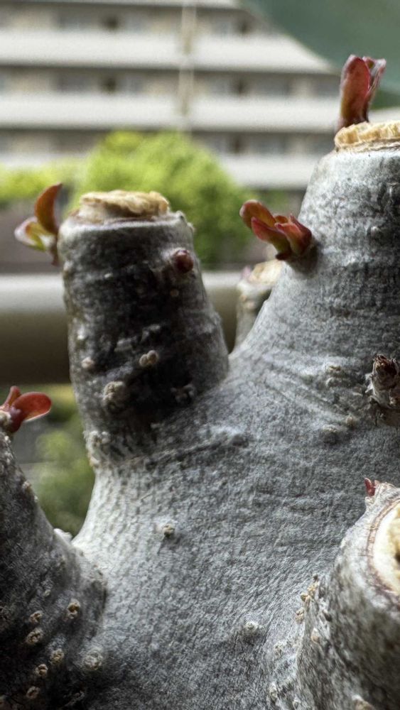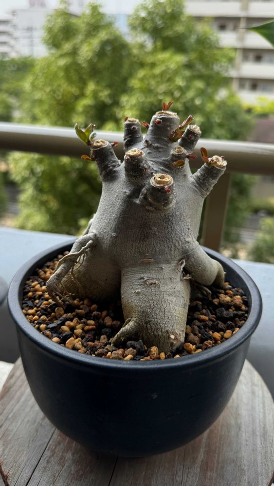 根から吸い上げた栄養はまず枝に行ってから塊根部に供給されるみたいなんで塊根部を太らせたいなら枝に栄養が行かないようにバッサリと切り太陽に当てて用土が渇いてからたっぷり水とこの時期は肥料をあげたらいいらしいです。