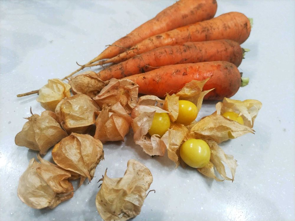 食用ホウズキとニンジンが一緒に植えてあるので食用ホウズキが自然落下していました。甘くて美味しい。