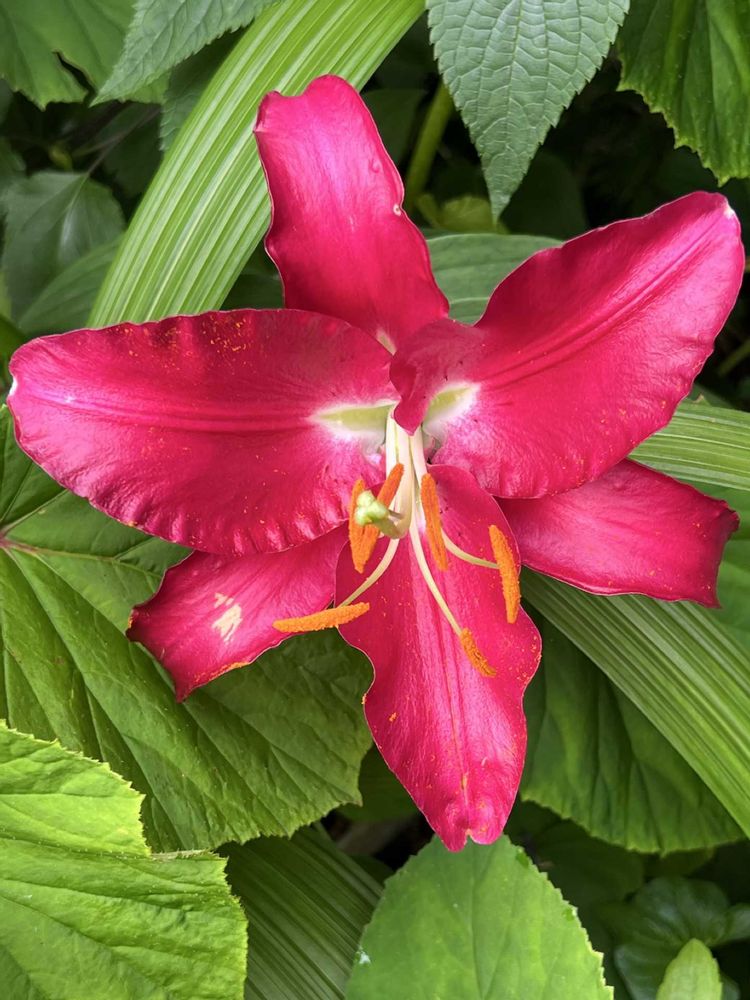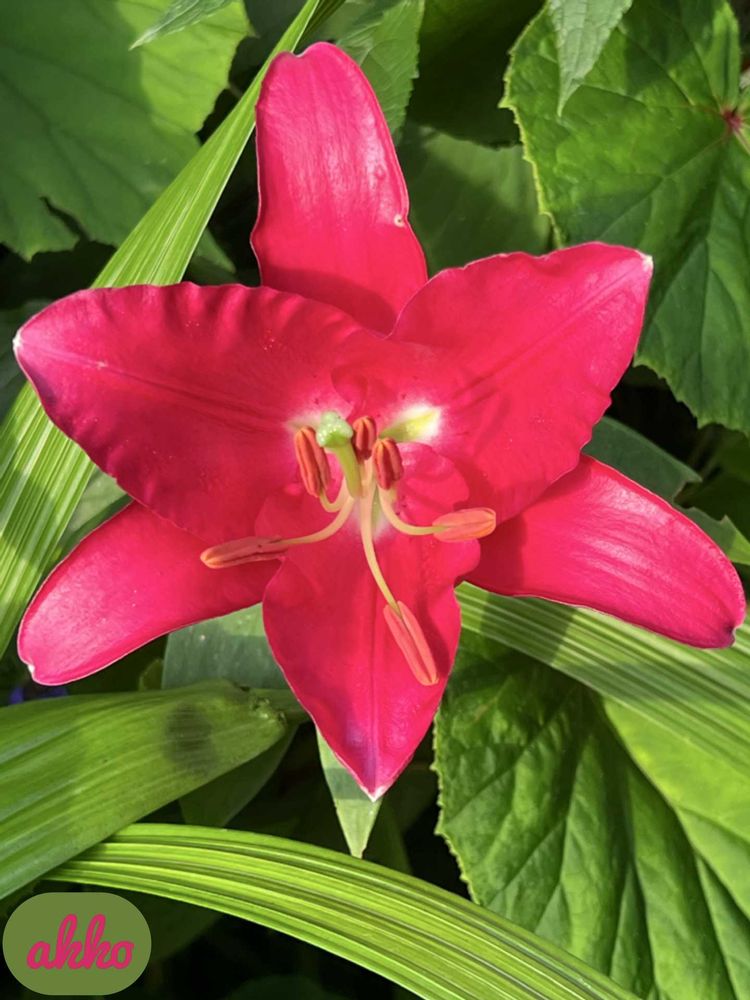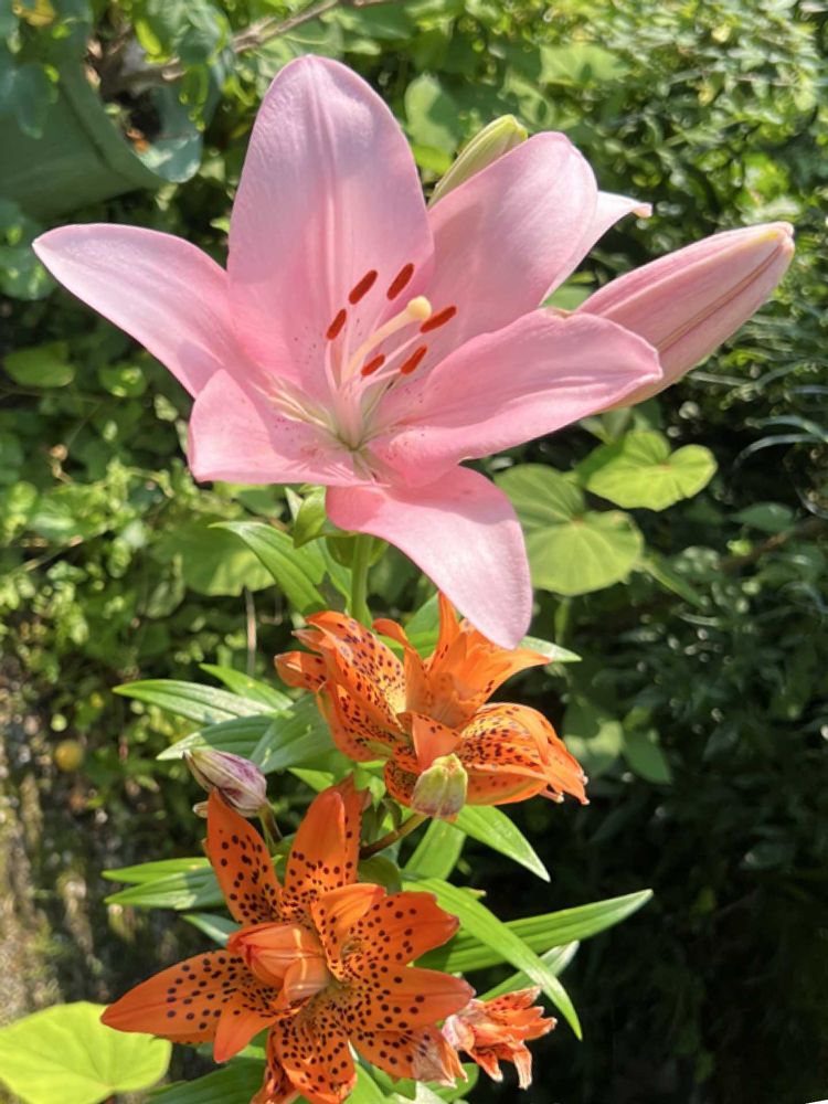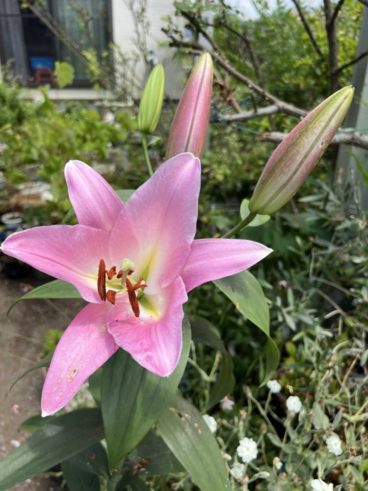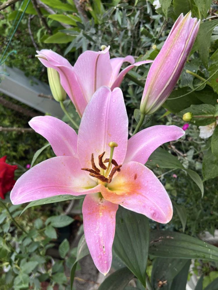 玄関前や鉢植えの百合が梅雨の合間に開花です