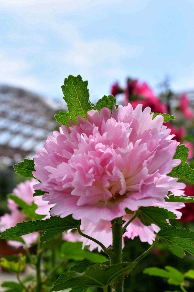 タチアオイ属の花で、優しいピンクの色合いと八重咲きが可愛く素敵でした✨😃