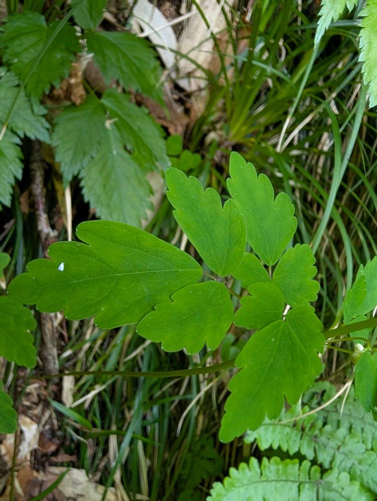 根出葉は1〜2個。葉身は2〜3回3出複葉。小葉は狭卵形から広卵形、または広倒卵状菱形。縁に粗い鋸歯。基部に小托葉はない。