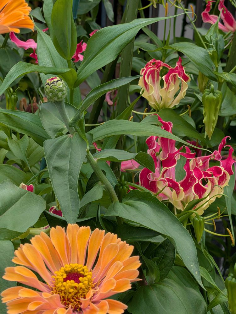 花友さんの畑地兼花壇に咲いているグロリオサとバジルの花です。
