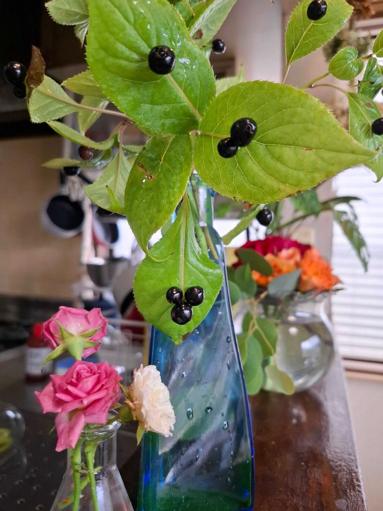 お花よりも青い実よりも、黒々とした実の存在感すごいです!もうすぐコロンと旅立つんでしょうね!!