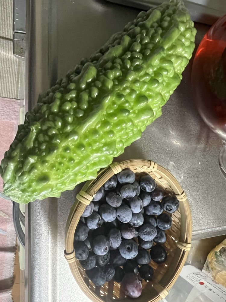 今朝、あばしゴーヤーとサンシャインブルー🫐を収穫しました。