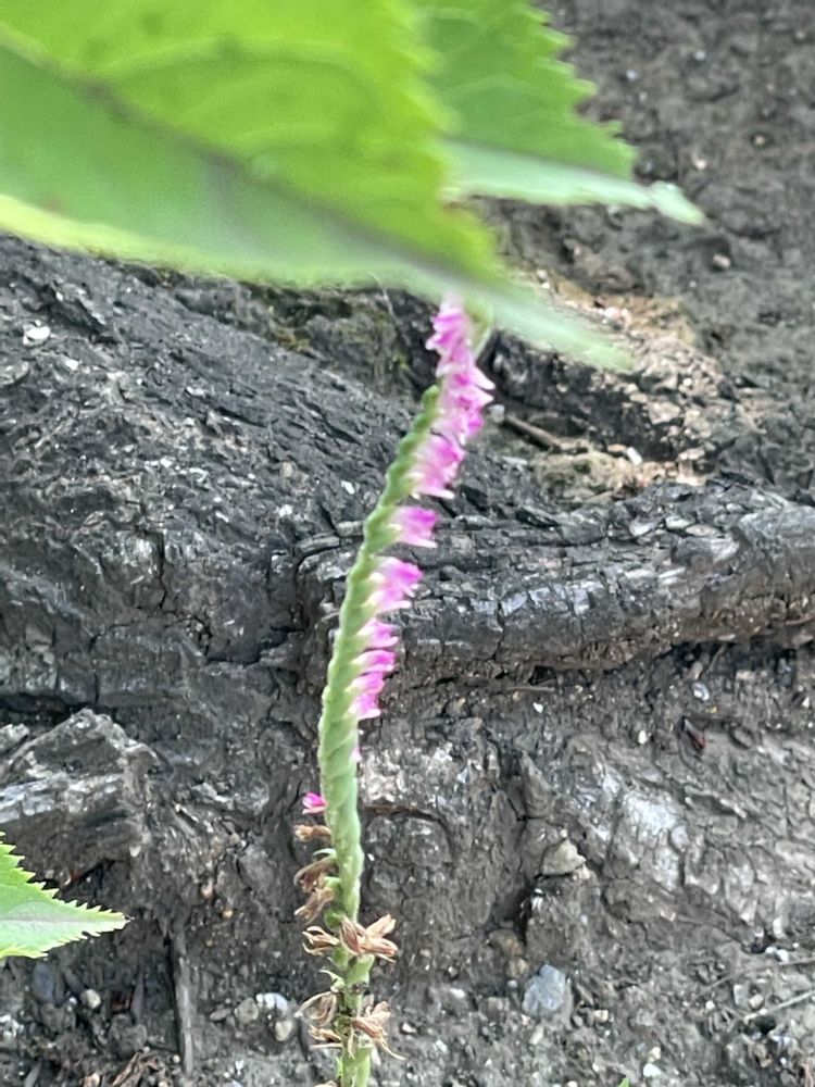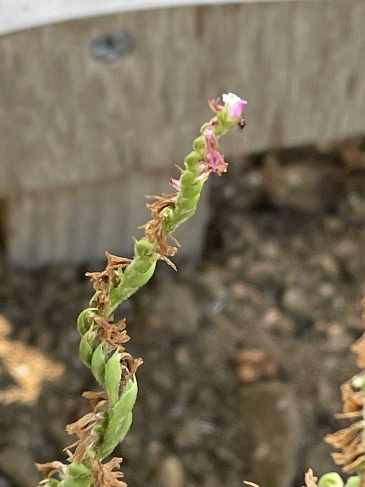 ④同じ花壇の少し離れた場所。てっぺんだけ残ったネジバナにアリさんがしがみついてました🐜