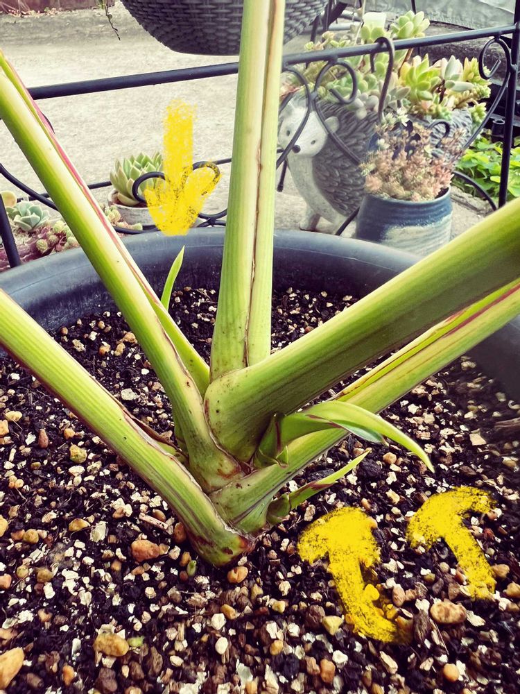 瀕死で焦げ焦げ、何とか発根したけどもうダメかもと諦めかけてた種類不明のコルジリネコンパクタから新芽が出てた‼️