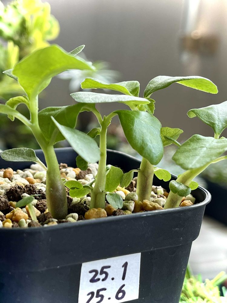 2024年3月22日に交配 2024年7月12日に結実した種を採取 2024年8月14日に種まき 2024年9月に発芽 その後、植え替えをして現在2025年7月に至る 今後の成長はアプリで記録 花が咲くまで継続