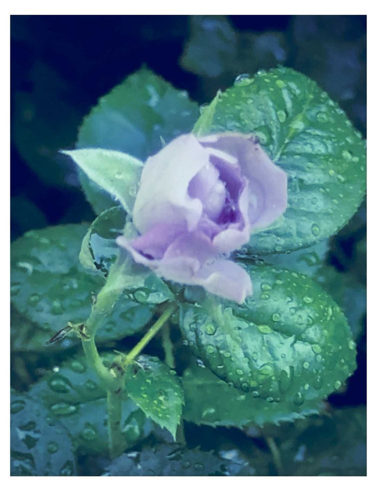 ;夜明けどき、"青い入江"の薔薇が開花し始めていました。
