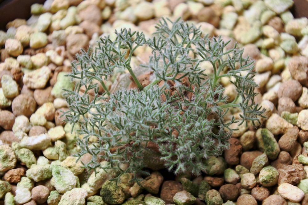 モンソニア・ペニクリナムの腰水していない方は、成長がゆっくりで、本体の色が渋めで、葉の色も渋めで伸びは少ないです。腰水している方との違いがとても興味深いです。