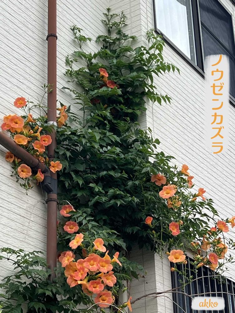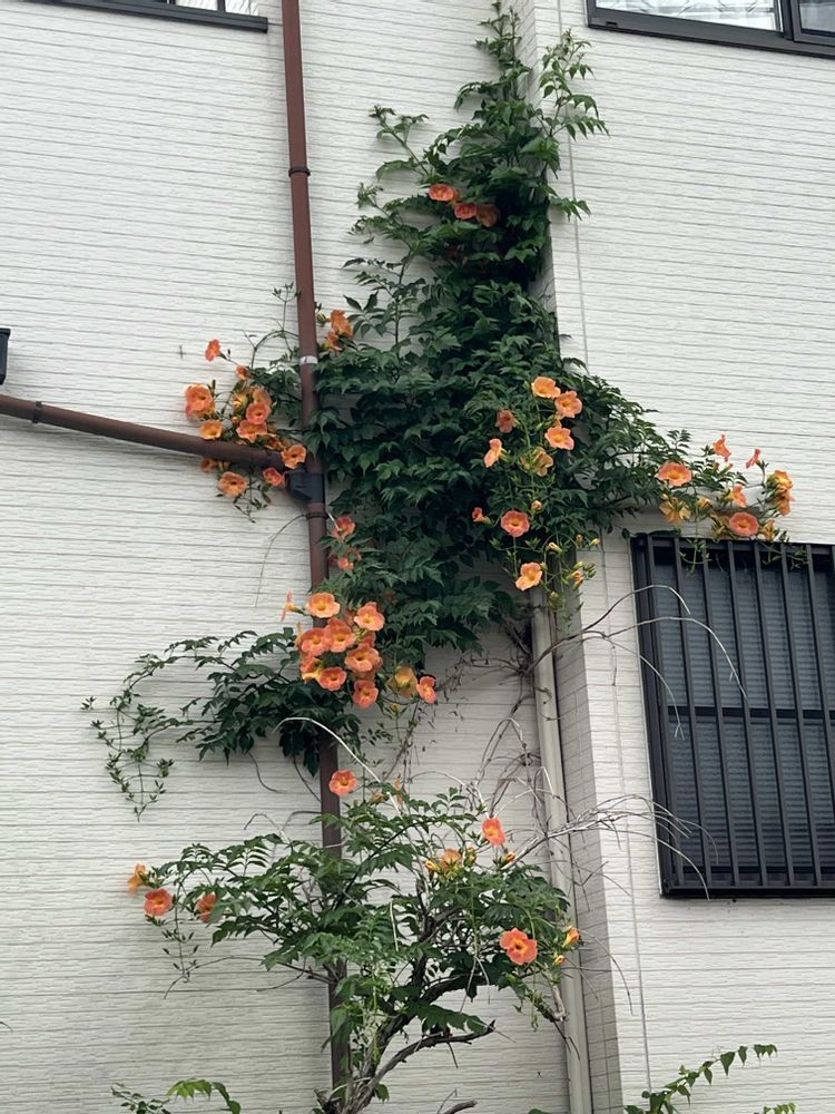 新宅の壁によじ登ってしまったノウゼンカズラ