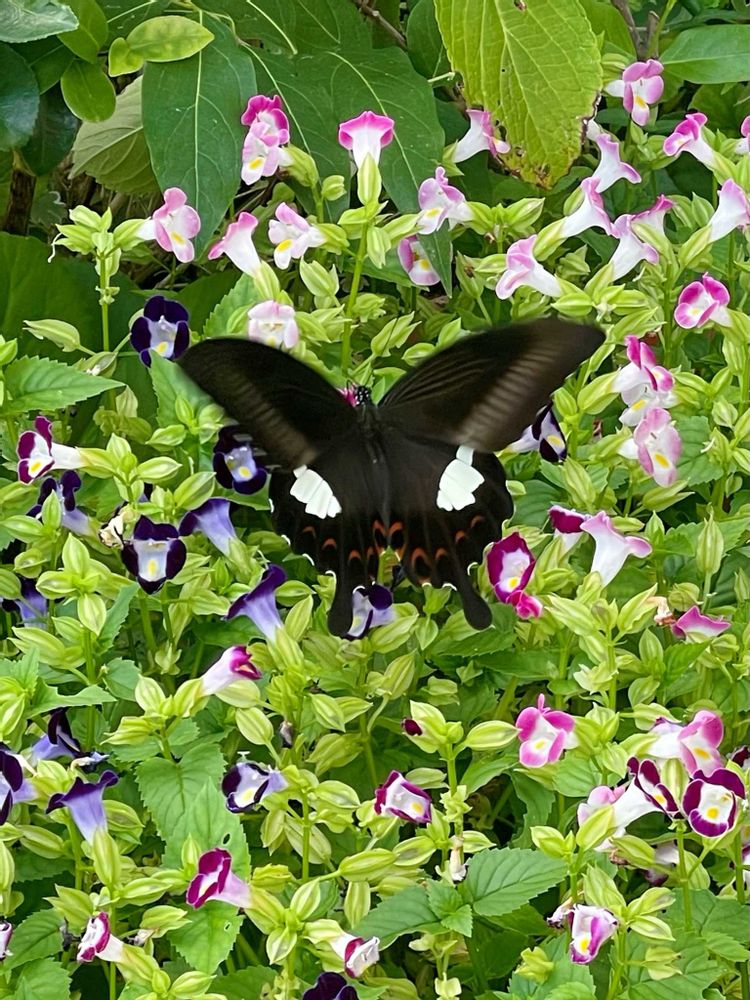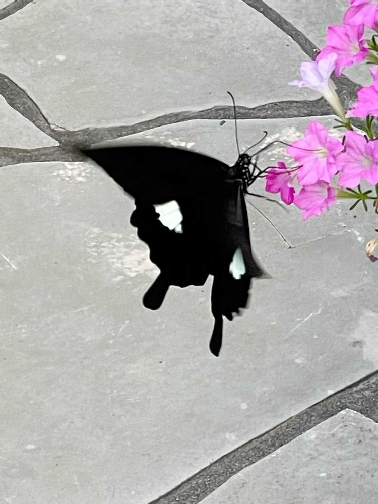 ペチュニアとサフィニアのお花にモンキアゲハが昨日今日と来ています。