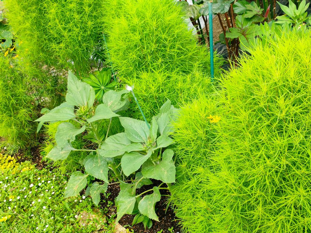 コキアと姫ひまわり(種まきっ娘)我が家にしては、珍しく コキアが大きく育っています。少し涼しげ。