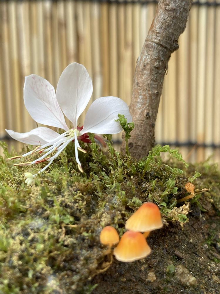 くるんと巻いた幹に、可愛いキノコ、それに華麗なガウラ(白蝶草の方が良いかな)、楽しい盆栽で良いですね👍👍👍😊