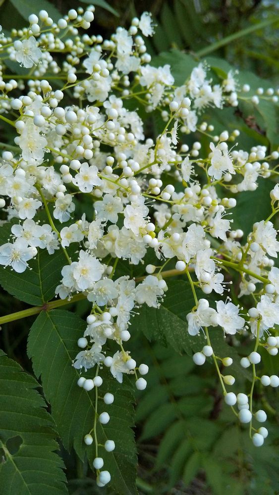 ホザキナナカマドでしょうか? 違っていたら教えて下さい 先の尖った濃い緑の葉に浮かび上がる 白い半透明の花弁と その中に散りばめられた小さな丸い蕾が とても可愛らしく美しいです