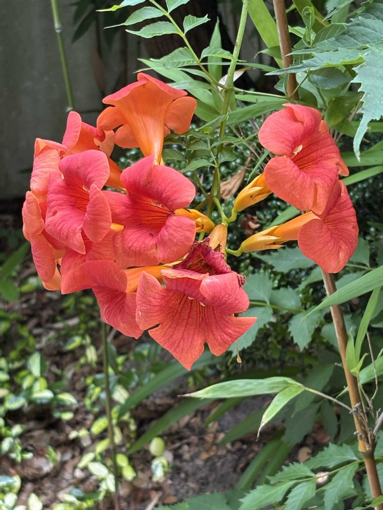 暑さの中で鮮やかな朱赤のノウゼンカヅラが咲いています。