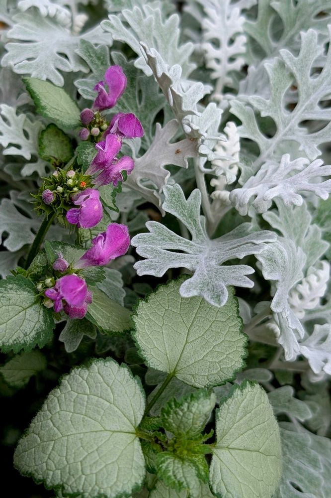 4️⃣毎年生えてくるシロタエギクの横にラミウムがこぼれ種で出てきました🤍