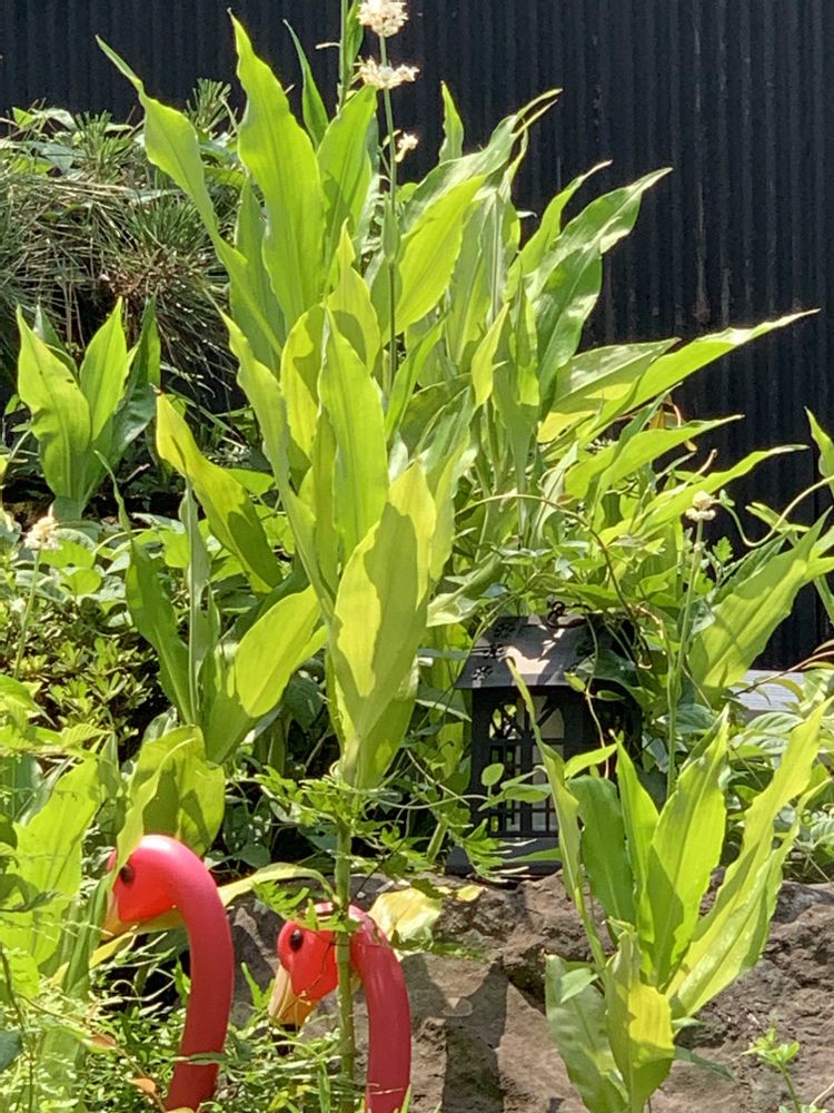 今年は庭にヤブミョウガさんがいっぱい自生して、今、白い花が咲いています😊暑いのでさらに放ったらかしズボラみぃの庭です😆雑草ですが葉は青々していて、お花は白くてクリンソウみたいに段に咲き、かわいいです😊フラミンゴ🦩🦩カップルも笑ってます