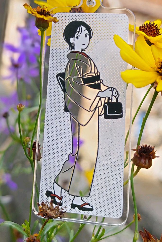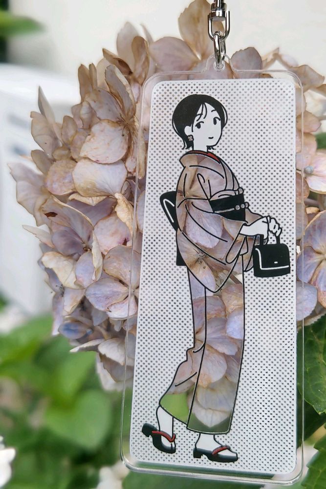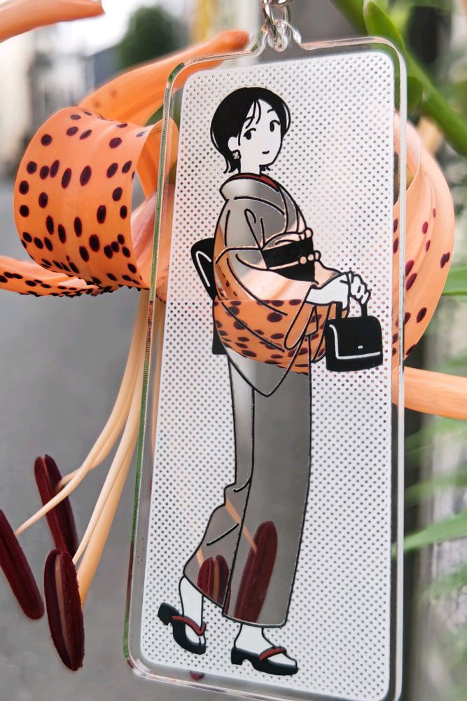 小さなアクリルホルダーに彫られたお散歩ちゃん。