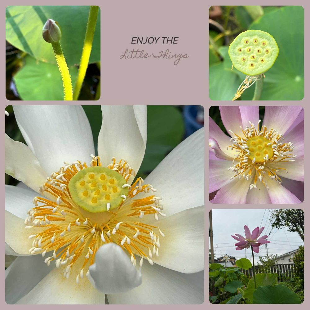 初めて咲いた茶碗ハス🪷の花も花びらが落ち花托が現れています。(右上)