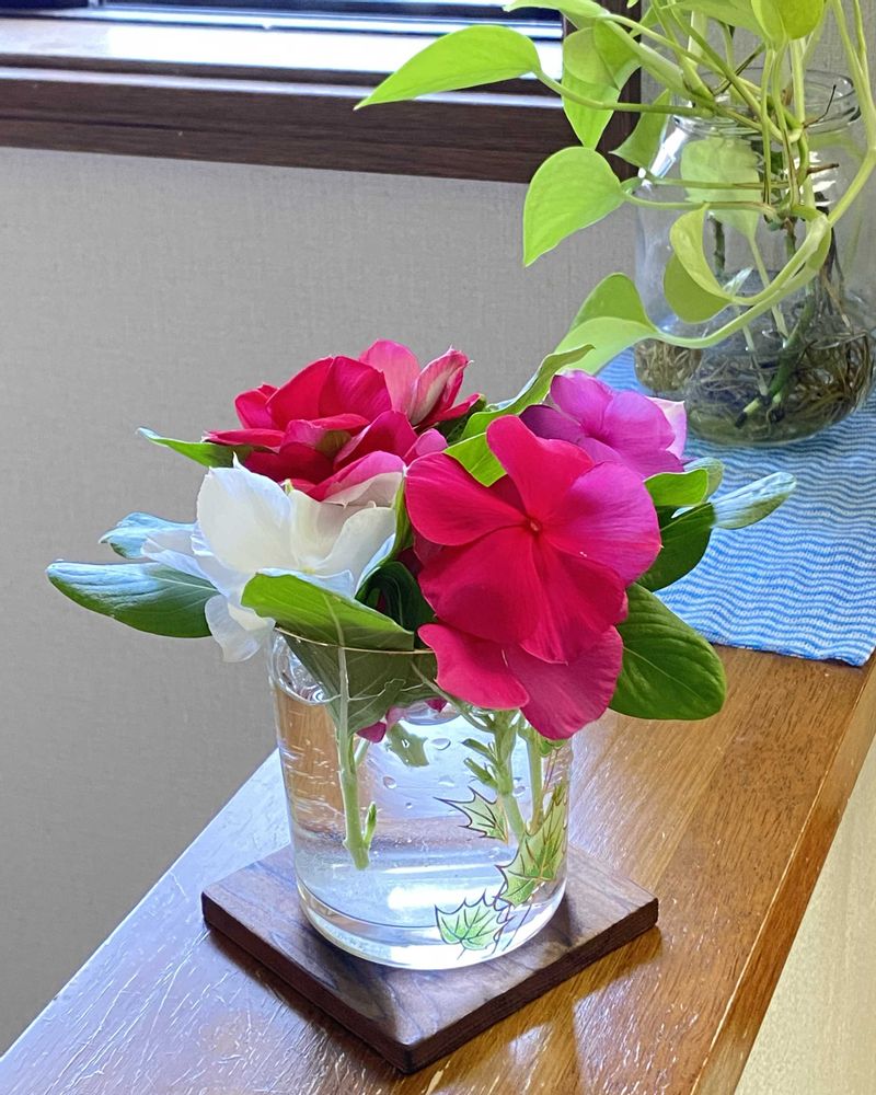 伸びすぎた日々草を剪定、落ちた花をグラスに入れて洗面台の横に・・