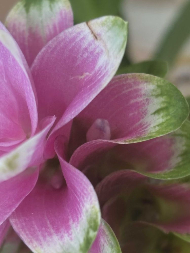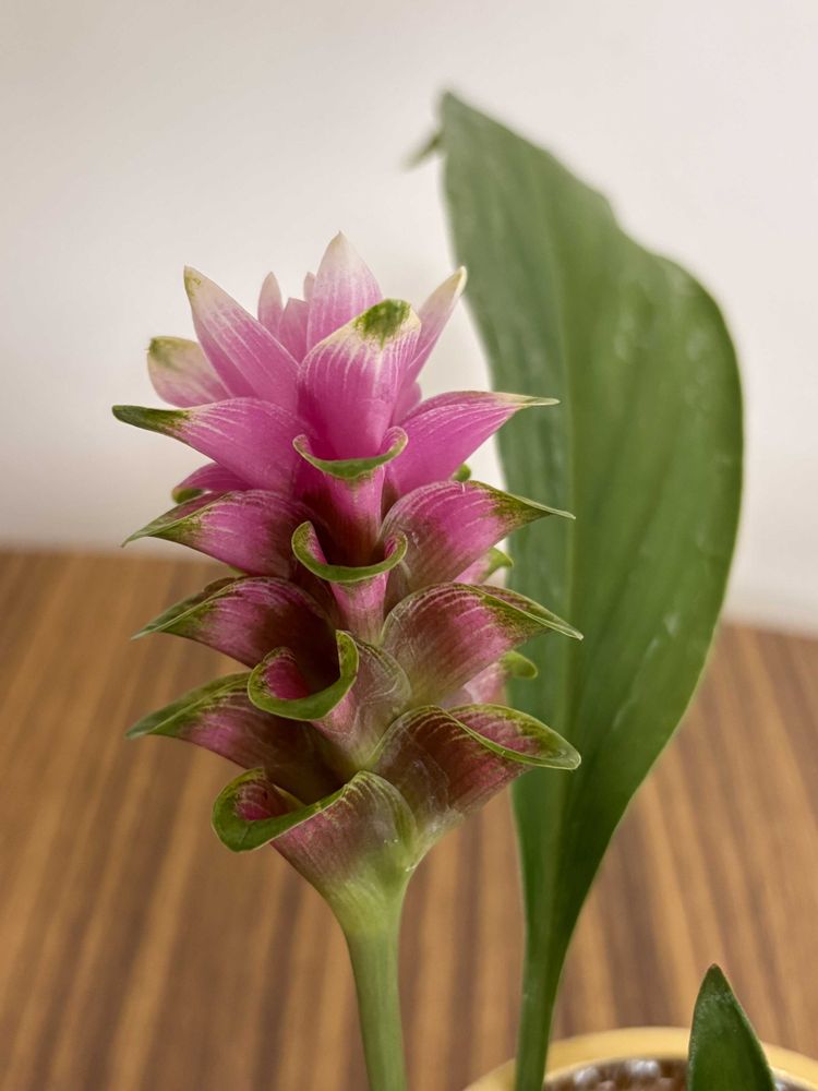 ピンクの部分は花ではなく苞(ほう)。苞とは、1個の花または花の集まり(花序)の基部にある特殊化した葉のこと。苞葉ともよばれる。本当の花はピンクのカップの隙間に咲く小さな花のこと。