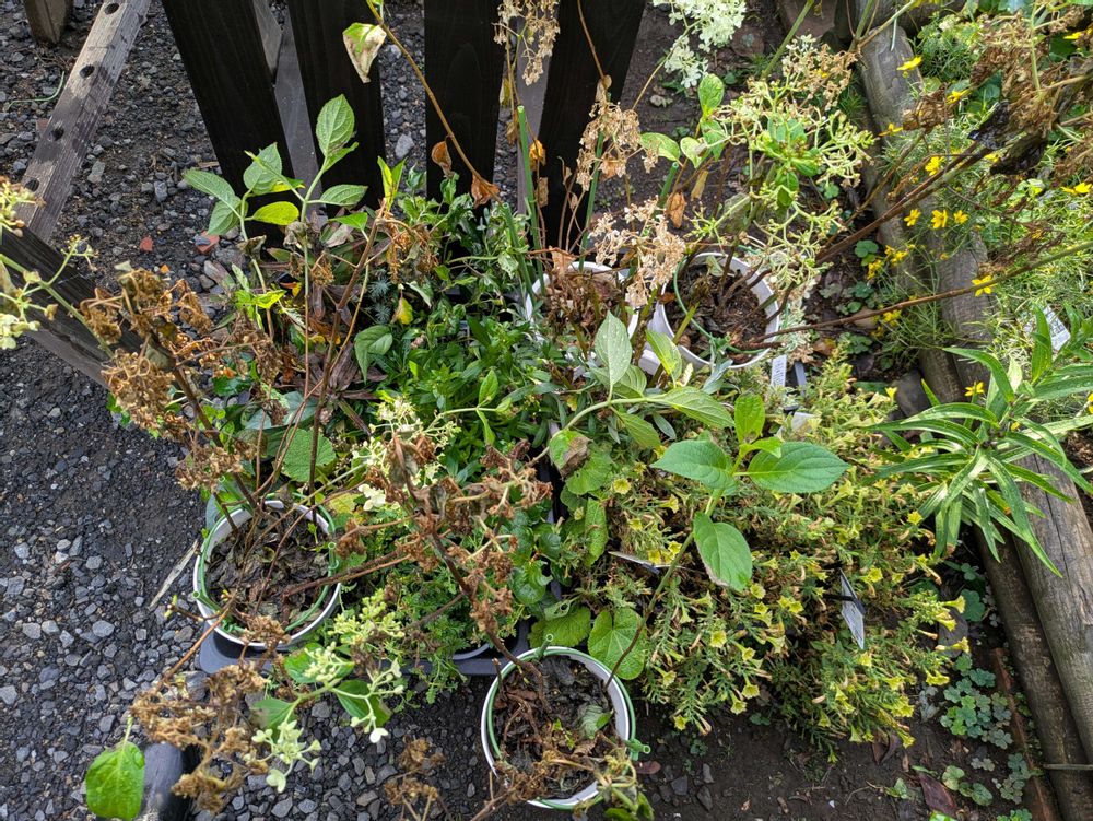 アナベル、ピラミッドアジサイと、来年用に持ち帰り、ホリホック、インパチェンス、シレネ、スーパーチュニアのイエローなど、ジイジに見つからないように車から降ろしました。