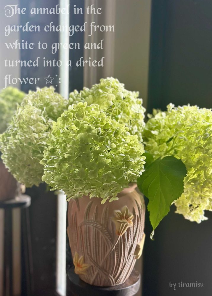 庭のアナベルが白からグリーンに変わり…ドライフラワーにしました♪