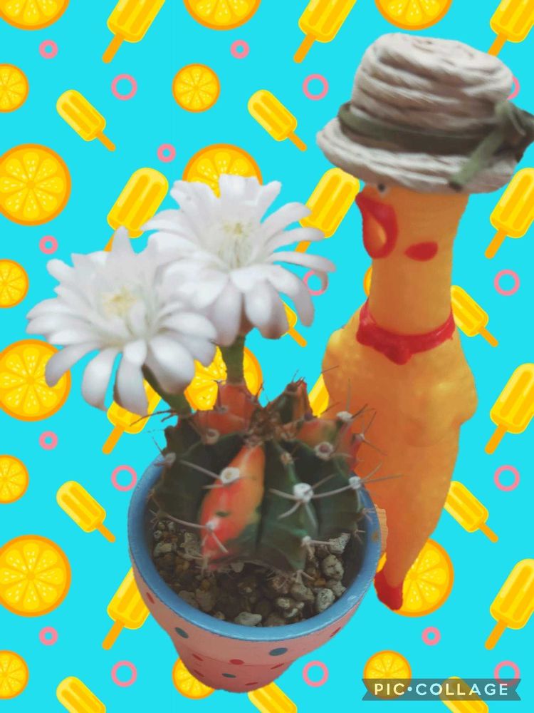 3枚目 ギムノさんのお花🌼まだ咲いているよ〜!👒被ったチキンちゃんもビックリ〜‼️