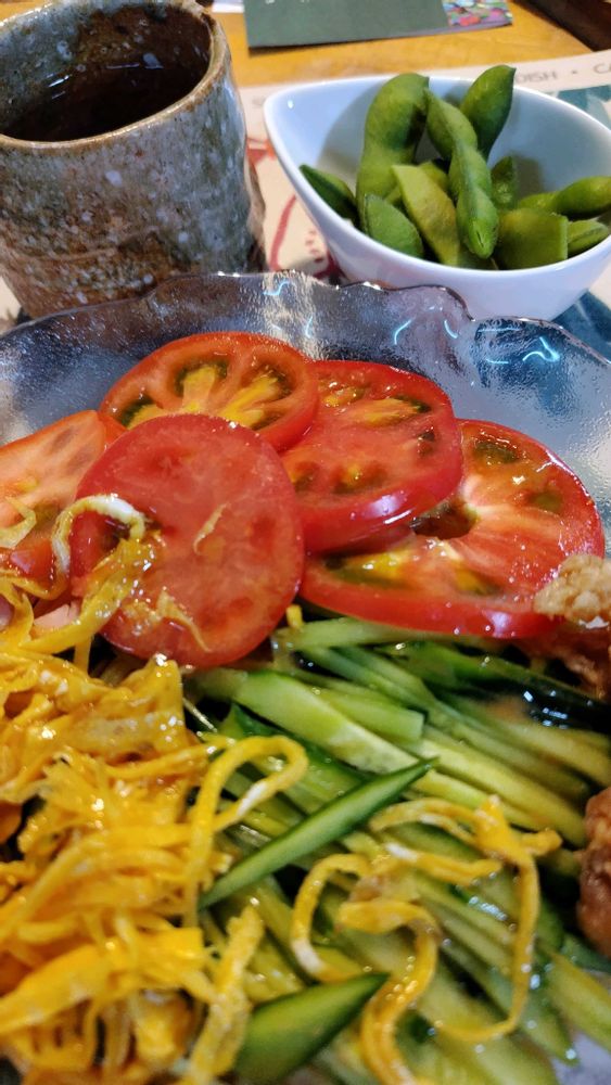 ②今日のお昼は、この🍅と朝採れの🥒をたっぷり乗せた冷やし中華をいただきました😋